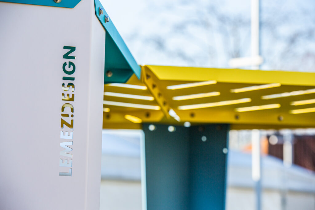 A tervezés, technologizálás után lézervágás és élhajlítás eredményeképpen elkészült alkatrészek az előkészítést követően pedig partnerünknél a kiválasztott színű porfestéssel lettek ellátva. A tetőlemezek horganyzott lemezből készültek, a lábelemek pedig tűzi horganyzást kaptak a festést megelőzően a tartósság érdekében.