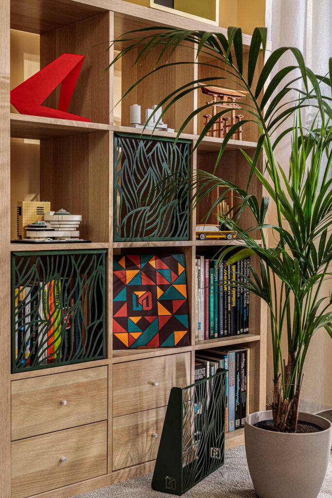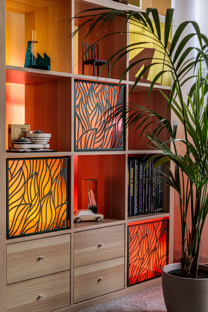 A polcbetét megfelelő számú alkalmazásával nem csak elfedni képes a rejteni kívánt tárgyakat, hanem tömegben aktívan tudja díszíteni – akár formálni is – a teret, valamint világítással ellátva a befogadó polcokat akár újabb kreatív megjelenést is képes létrehozni – most már a minták inverzében megjelenő – intenzív színek segítségével.