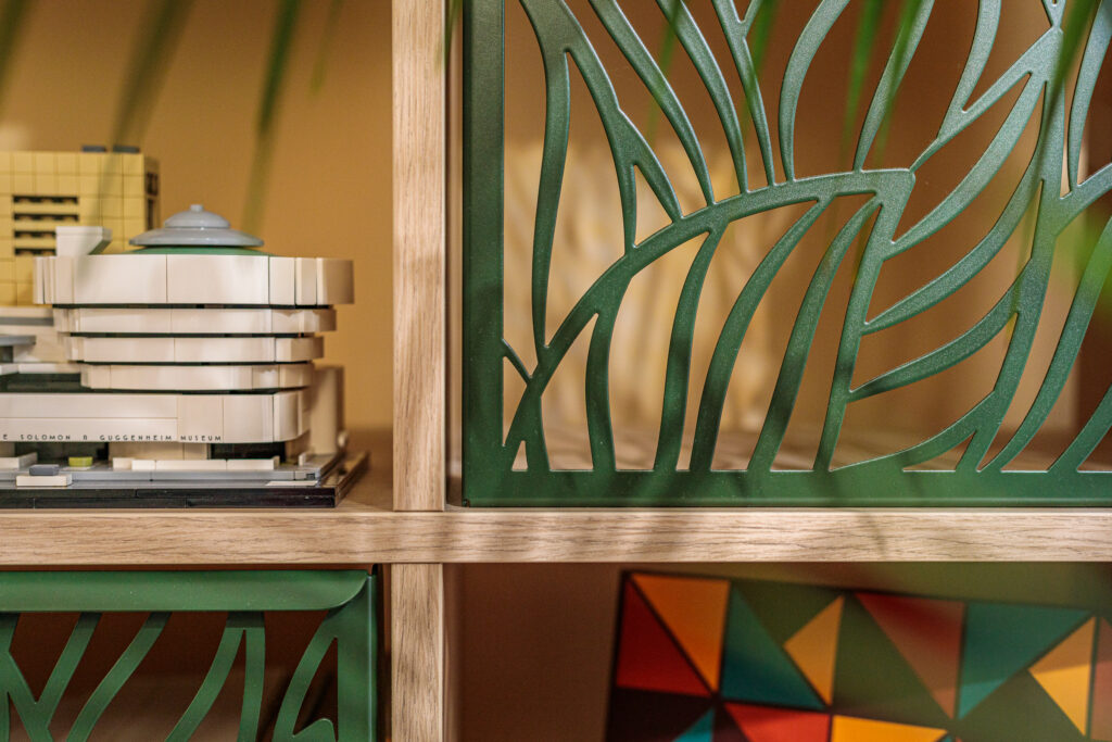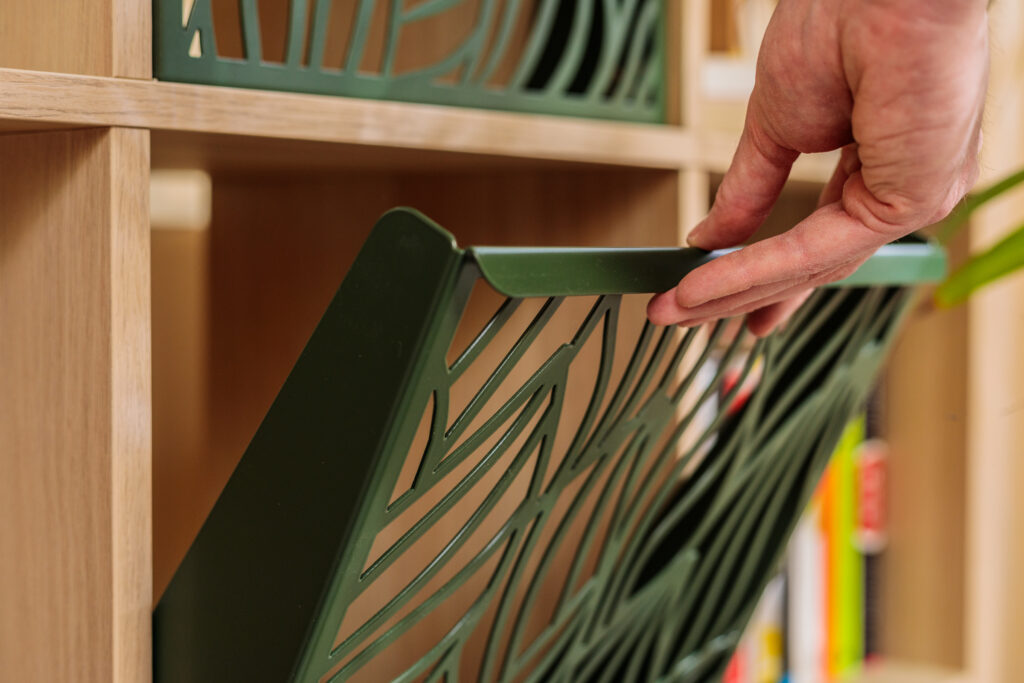 A lemezbetét fejlesztése azonban itt nem állt meg! Formatervezőnk egy újabb lemez/mintaréteget illesztett a díszítőbetét előlapja mögé., hogy üde hangulatot, játékosságot csempészve törje meg egy teljesen szigorú geometriájú bútor statikusságát.